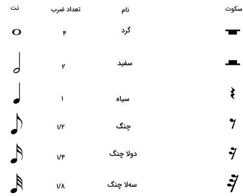 نامگذاری نت ها : دو – ر – می – فا – سل – لا – سی (do, re, mi, fa, sol, la, si).